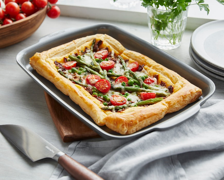 TIPS Brug gerne frosne ærter i stedet for friske... eller erstat asparges med artiskokhjerter... eller cherrytomater med rød peber. Det hele fungerer! Vil du have en anden type ost? Vælg noget, der smelter godt, som schweizerost eller provolone. Vi elsker også denne tærte med brie eller burrata, men tilsæt dem til sidst, så osten forbliver hel.
