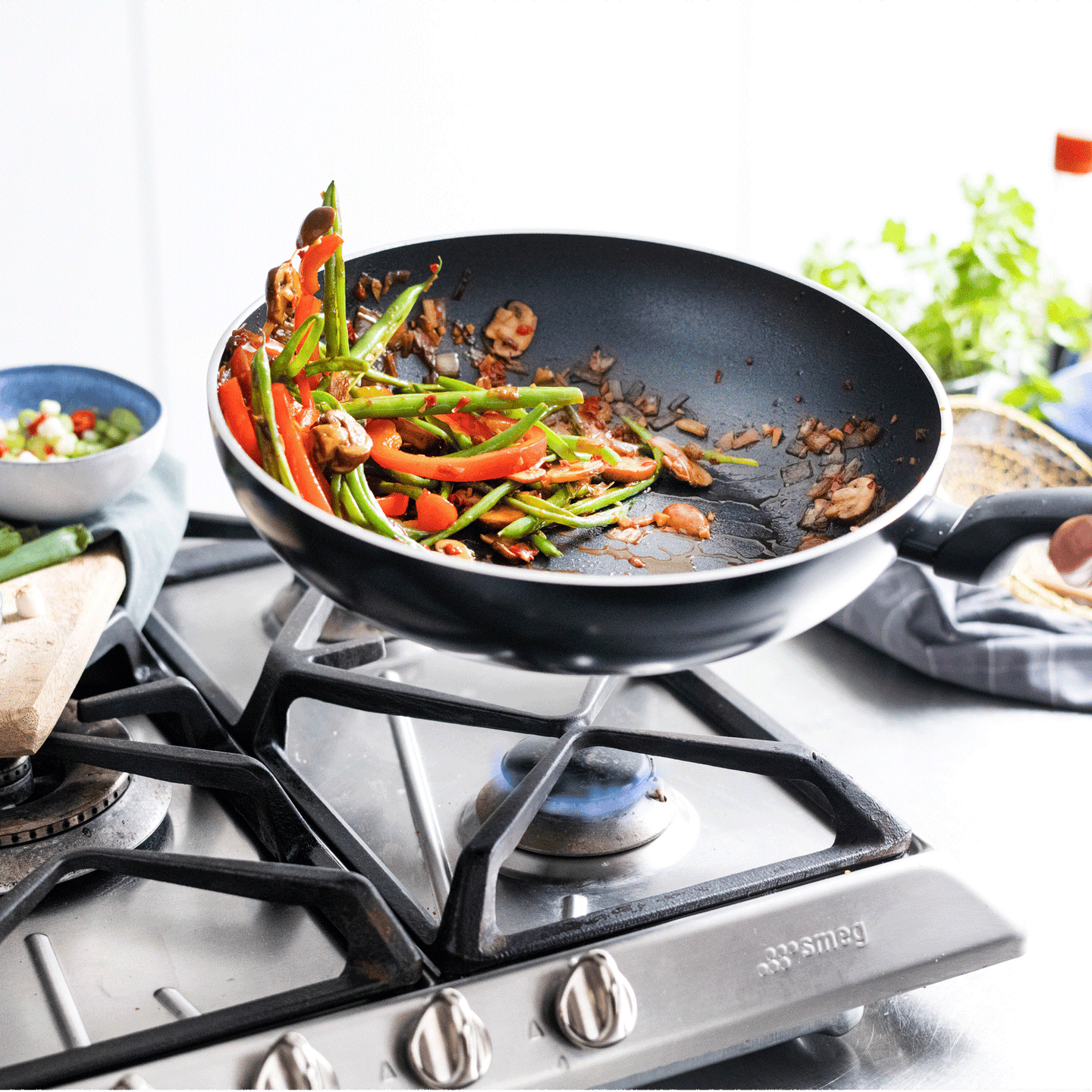 Vores keramiske non-stick-belægning er silkeglat. Du kan derfor spare på fedstoffet, og slipper for at maden brænder på derfor behøver den heller ikke skrubbes bagefter. Sundt, hurtigt og nemt!