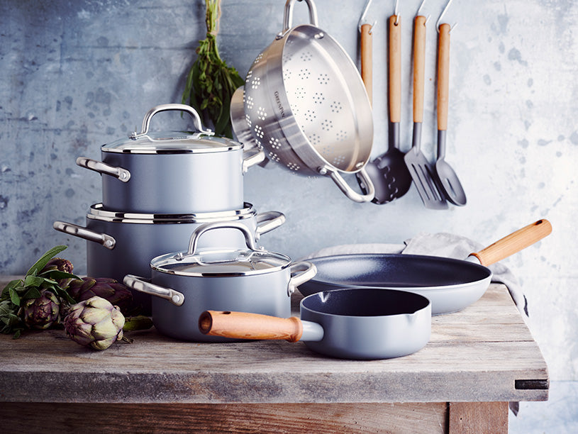 Den specielle farve og de kølige træhåndtag giver kollektionen et skandinavisk look & feel.