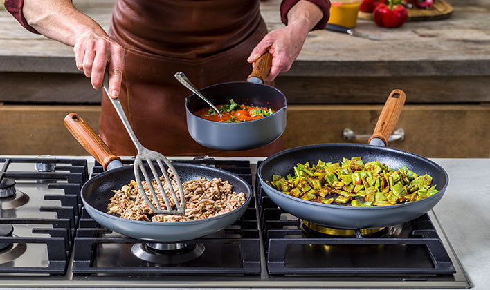 Vores keramiske non-stick-belægning er silkeblød. Du har brug for mindre olie eller smør, og der skal ikke skrubbes bagefter. Sundt, hurtigt og nemt!