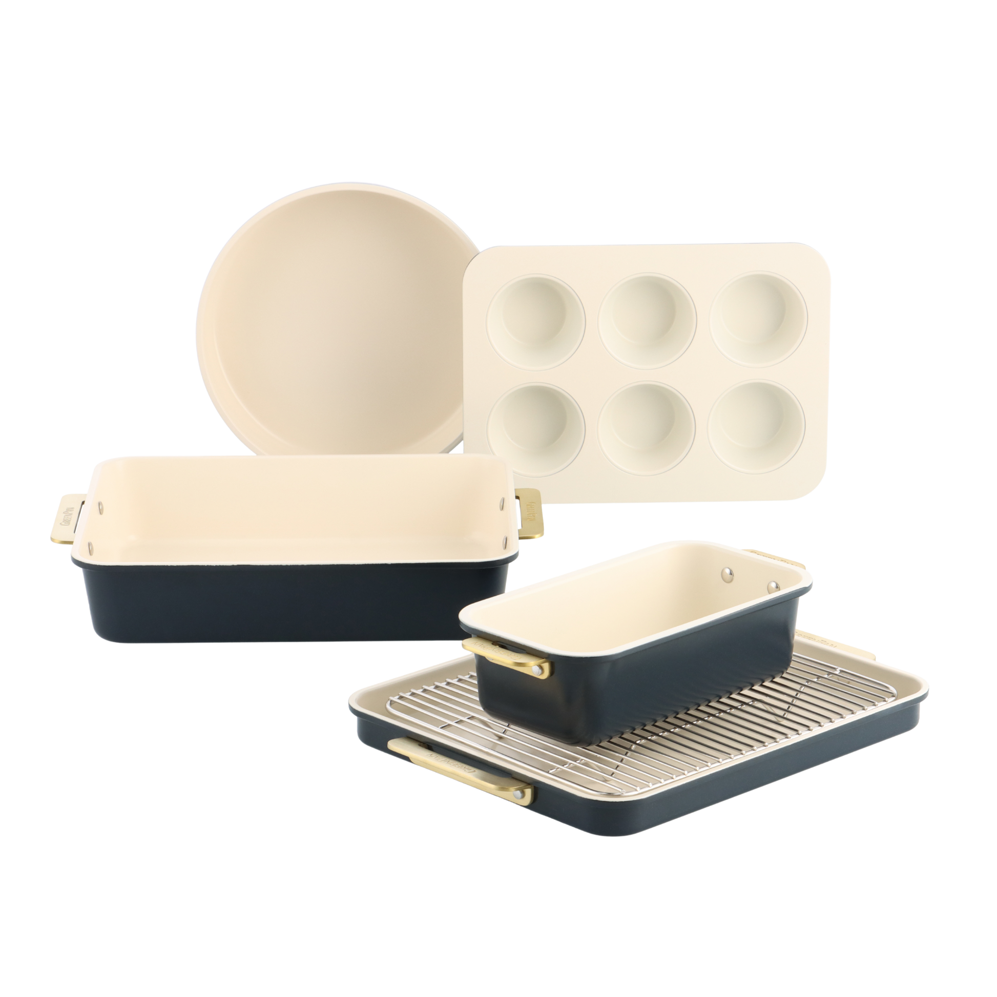 Dette sæt indeholder: - Rund kageform - 6-kops muffinsform - Brødform - Kageplade - Rektangulær kageform - Afkølingsrist